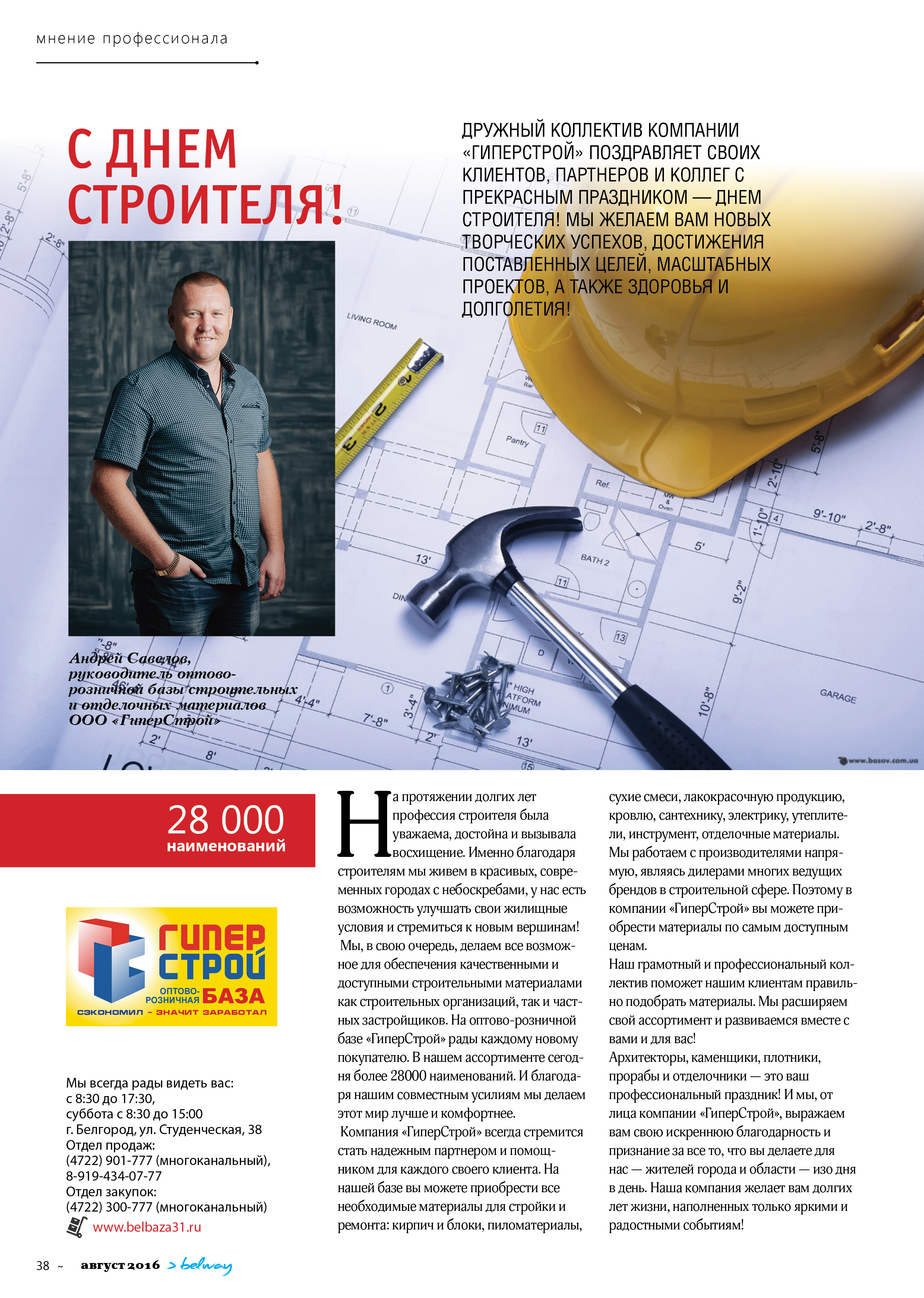 Архитекторы, каменщики, плотники, прорабы и отделочники — это ваш профессиональный праздник! И мы, от лица компании «ГиперСтрой», выражаем вам свою искреннюю благодарность и признание за все то, что вы делаете для нас — жителей города и области — изо дня в день. Наша компания желает вам долгих лет жизни, наполненных только яркими и радостными событиям!